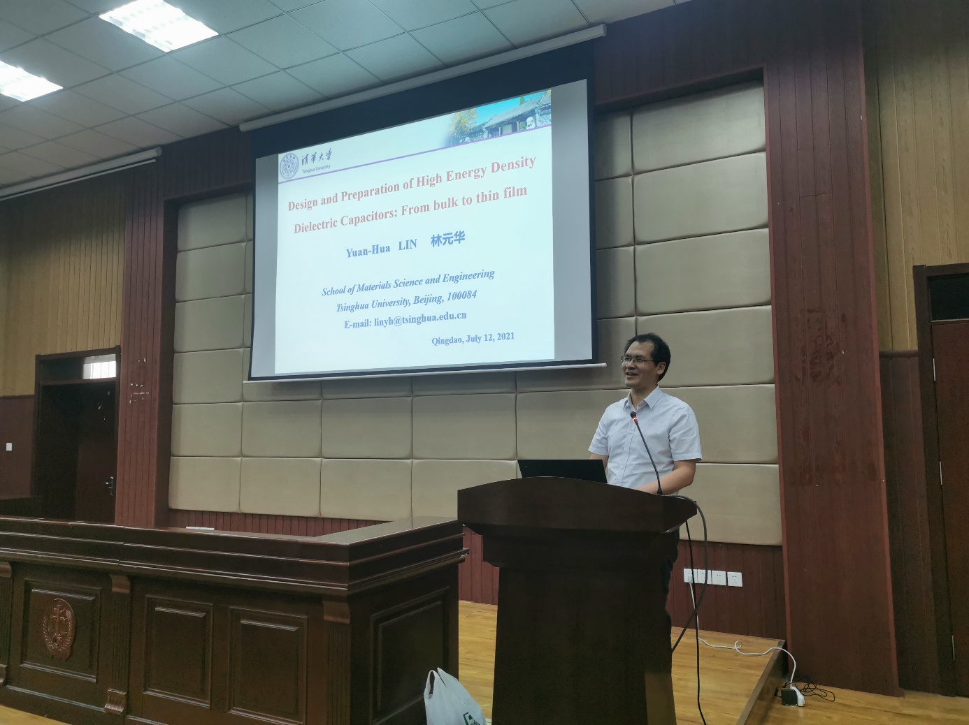 林元华教授报告的题目为《基于畴结构调控的高能量密度介电电容》。报告中,林教授首先简单介绍了一下电介质电容器工作原理及其性能优势;然后重点讲述了如何通过精准调控极化畴去优化电介质材料的电位移及击穿场强,从而获得高性能电介质材料;他用深入浅出的语言向我们展示了他们团队在研发新型储能电介质材料上的最新进展。报告结束后,参加会议的老师和同学们陆续向林教授提出了自己感兴趣的问题,林教授详细回答了老师和同学们的提问,不仅解答了老师和同学们的疑惑,更激发了同学们的科研兴趣。