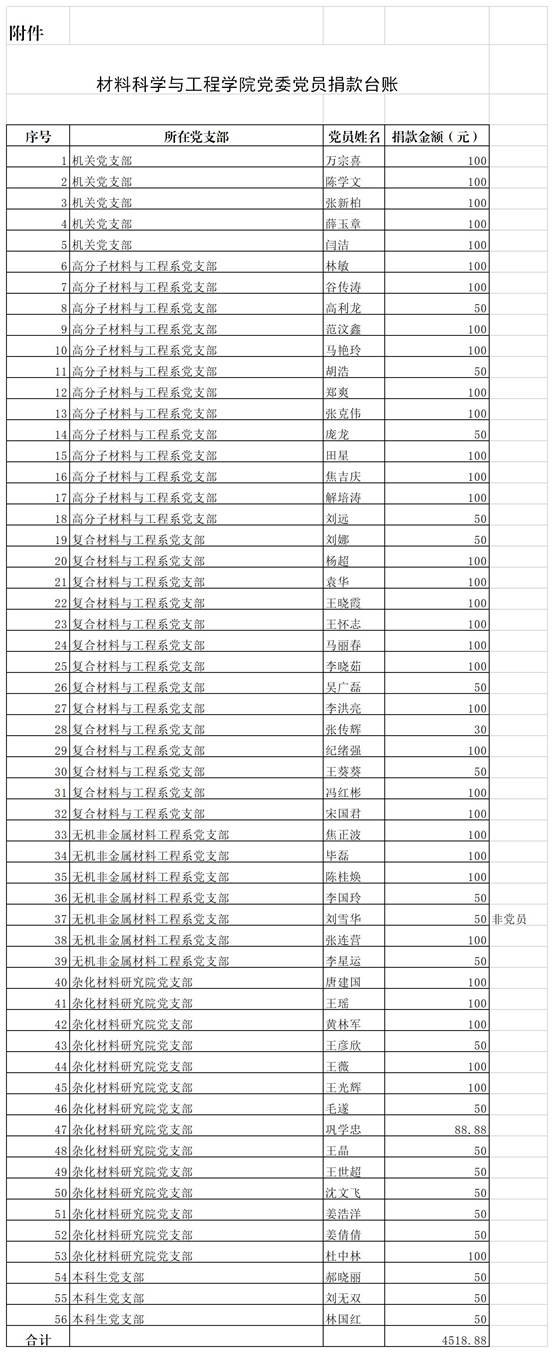 连日来,各支部党员踊跃捐款,共同为疫情防控贡献力量,院党委收到56人捐款共计4518.88元(捐款明细附后)。特别是无机非金属材料工程系的刘雪华老师,作为民主党派人士,也积极捐款奉献爱心。强烈的捐款意愿和积极的捐款行动,充分体现了广大教职工党员支持疫情防控斗争的强烈愿望,彰显了共产党员的初心和使命。参加捐款的党员师生表示,守初心、担使命,充分发挥先锋模范作用,为打赢疫情防控阻击战贡献应有力量。