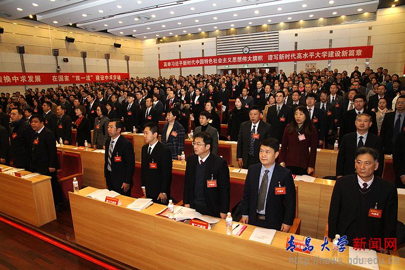 第三次代表大会”的会标,后幕正中是镰刀和锤头组成的党徽,10面鲜艳的红旗分列两侧。会场两侧分别悬挂着“坚持内涵发展 坚持特色发展 坚持创新发展 坚持以人为本 坚持追求卓越”“在服务山东新旧动能转换中求发展 在国家“双一流”建设中求突破”的横幅,会场后面悬挂着“高举习近平新时代中国特色社会主义思想伟大旗帜 谱写新时代高水平大学建设新篇章”的横幅。