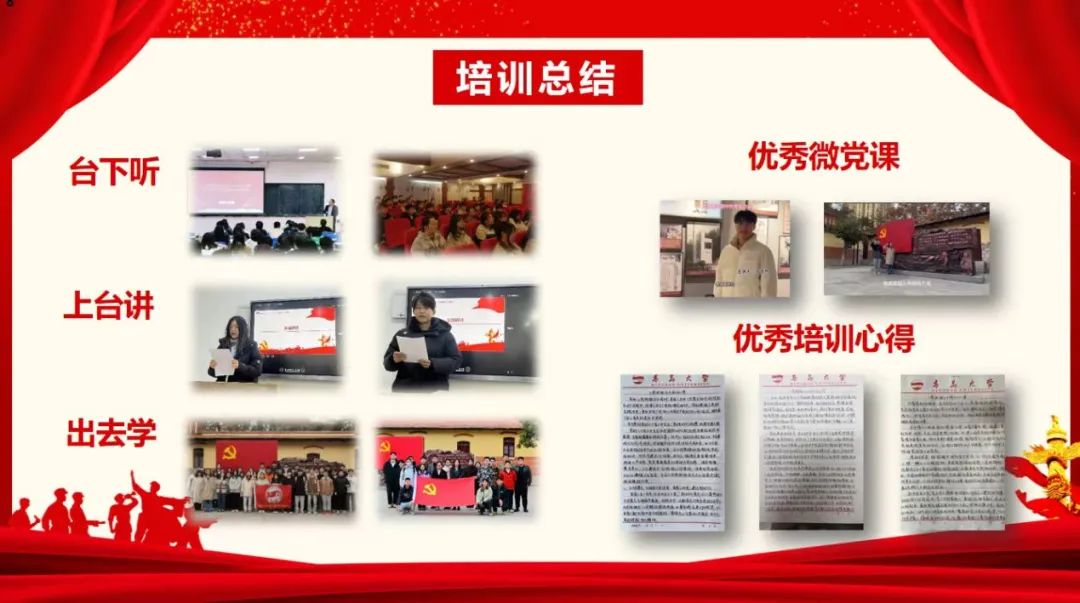 青年先锋学社社长叶振昊同志对此次入党积极分子培训班的开展情况进行总结。本次入党积极分子培训在学院党委的领导下,依托青年先锋学社展开,培训时间从11月21日起,至11月29日止,为期9天。本着严格要求、夯实理论、广泛实践的原则,力求把好入党积极分子成长路途上的“入口关”,上好“第一课”。此次培训通过组织“台下听——党委书记和支部书记讲党课”、“上台讲——学员交流研讨培训感悟”、“出去学——青岛市党史纪念馆实地研学”,知行合一,实现了培养考察多维度、立体化。同时也涌现出了一批优秀学员,产出了优秀微党课和培训心得等学习成果。此次培训旨在激励同学们做一名有理想、敢担当、能吃苦、肯奋斗的新时代好青年,紧跟党的步伐,贯彻党的思想方针,不忘初心,砥砺前行。