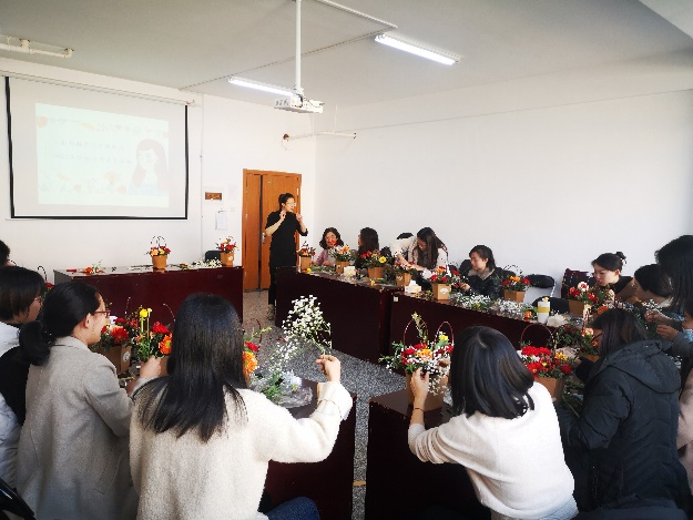 活动现场,康乃馨、洋桔梗、非洲菊、红豆等各色花卉摆满现场。插花老师从鲜花的名称、养护、裁剪、搭配等方面仔细讲解,老师们边听边动手,精心修剪、整枝、构思、搭配,一个个造型优美、色彩活泼的插花作品展现在大家面前。