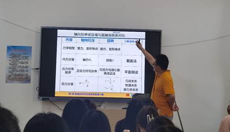 林老师首先复习扭转变形及相对扭转角等上次授课内容,然后引入本节课的刚度计算,说明刚度条件的三类计算:校核刚度,设计截面尺寸及计算许可载荷。课堂授课讲授梁的概念时,通过生动事例,分析梁与杆和轴的相应特点;旁征博引,分析孙悟空金箍棒的“结构诠释”,空心结构应用以及工程设计中的力学思想。注重授课互动,顺利开展课堂教学。