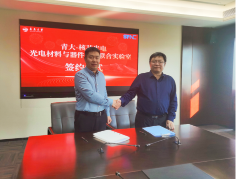 座谈会上,院长黄林军和核芯光电曹学蕾共同签署《青岛-核芯光电材料与器件创新联合实验室共建协议》。