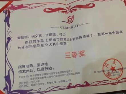 隋坤艳教授精心指导,参赛选手栾朝辉、侯文文、许璐瑶、付贝提交的作品《便携可穿戴运动检测传感器》荣获三等奖。