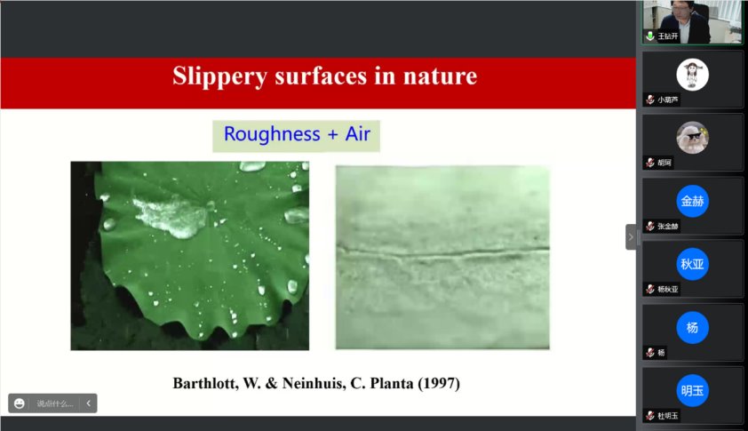 报告中,王钻开首先以沙漠甲虫、仙人掌、猪笼草、蜥蜴皮肤等为例,介绍了自然界中这些依靠其精妙的微观结构实现自发、定向运输液体的神奇界面现象,系统地介绍了近年来其课题组在仿生界面材料、器件设计及定向调控液体传输方面的工作。同时,王钻开教授结合自身的科研经历,介绍了如何利用9平方米的实验面积做出具有世界影响力的科研成果,鼓励大家在科研道路上要不断探索,勇于坚持。报告后,王教授与师生们就相关问题进行了热烈的探讨与交流。