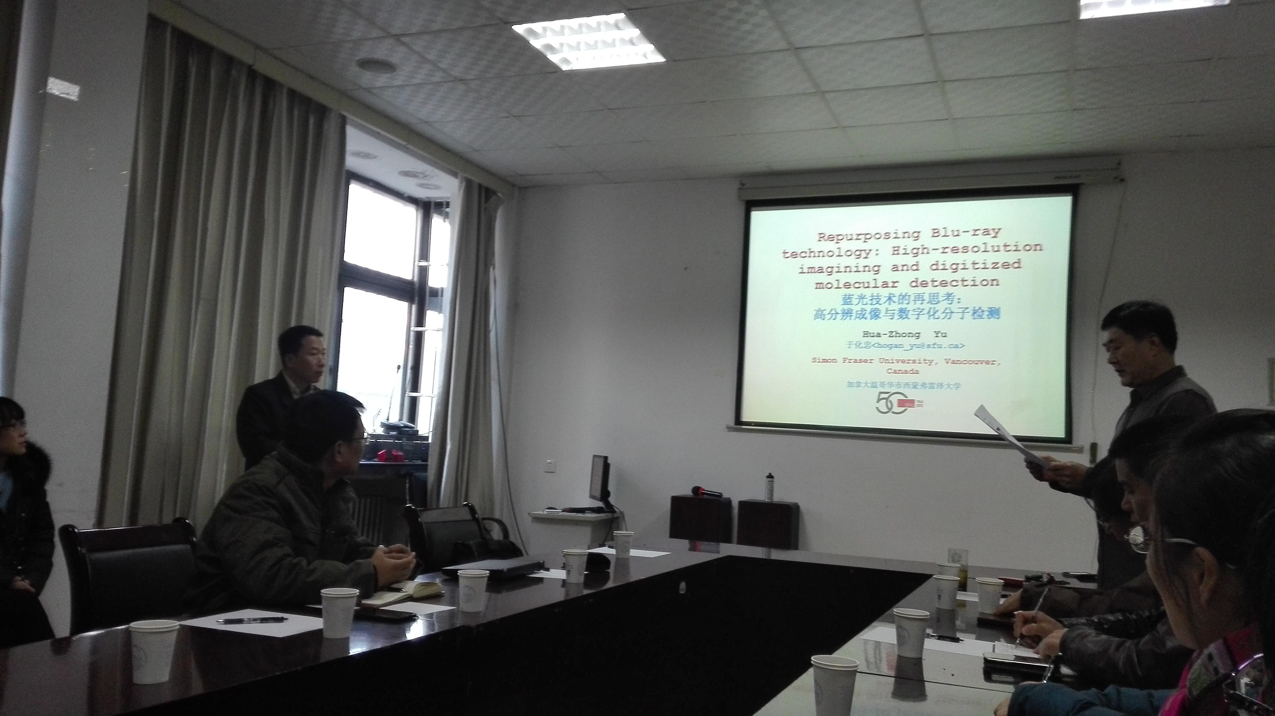 于化忠教授1991年毕业于济南山东大学化学系;1994年获得山东大学和中科院大连化学物理研究所联合培养硕士学位(顾月姝教授和李学初研究员;光华奖学金);1997年在北京大学取得理学博士学位(刘忠范院士的首届博士生;北京大学优秀博士论文世顺奖);1997年到1999年在加州理工学院(Caltech)从事博士后研究工作,导师为诺贝尔奖获得者激光化学家兹维尔教授(Ahmed Zewail)和电化学家安森教授(Fred Anson);2000年工作于加拿大国家科学院;2001年受聘于SFU,2009年破格提前晋升为教授。其主要研究领域集中在DNA表面化学和适配体电子传感器,光盘生物分析和材料化学,半导体的分子改性和电学表征。整个报告过程中,于教授幽默风趣,深入浅出的将其主要研究领域的成果呈现给大家,思路敏捷,创新性强,其主要工作中的光盘生物分析曾被Nature评论为可以用CD聆听人类自己的DNA信息的创举,其团队还在此基础上推出了用手机拍照技术就可以方便快捷的对某些化学物质进行半定量检测的新技术。