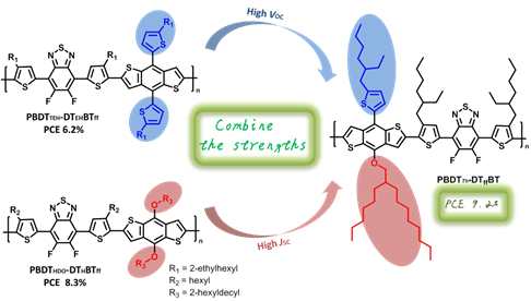 青年教师谷传涛、丛海林与中科院青能所阳仁强研究员合作,设计、合成了非对称性的二维苯并二噻吩作为给体单元,与经典的受体单元二噻吩苯并噻二唑共聚获得高性能聚合物。相比于对称取代的同系物,该聚合物在保证高短路电流和高填充因子的同时获得了更高的开路电压,因此获得了更高的光电转换效率。该聚合物与PC71BM共混作为活性层构筑的聚合物太阳能电池器件获得了9.2%的光电转换效率,与非富勒烯受体ITIC共混作为活性层构筑聚合物太阳能电池器件,也表现出了优异的光电转换效率(7.8%)。该成果发表在Journal of Materials Chemistry A(DOI:10.1039/C7TA10247J)上。该杂志是英国皇家化学会出版社旗下材料科学领域的国际顶尖期刊,影响因子8.867。谷传涛与青能所博士生刘德昱为该论文共同第一作者,丛海林、阳仁强为该论文共同通讯作者。最近,丛海林等人领衔的研究小组还在氧化钒基聚合物太阳能电池领域取得重要进展,成果发表在美国化学会顶尖材料期刊ACS Applied Materials & Interfaces(DOI:10.1021/acsami.7b02164)上,影响因子7.504。