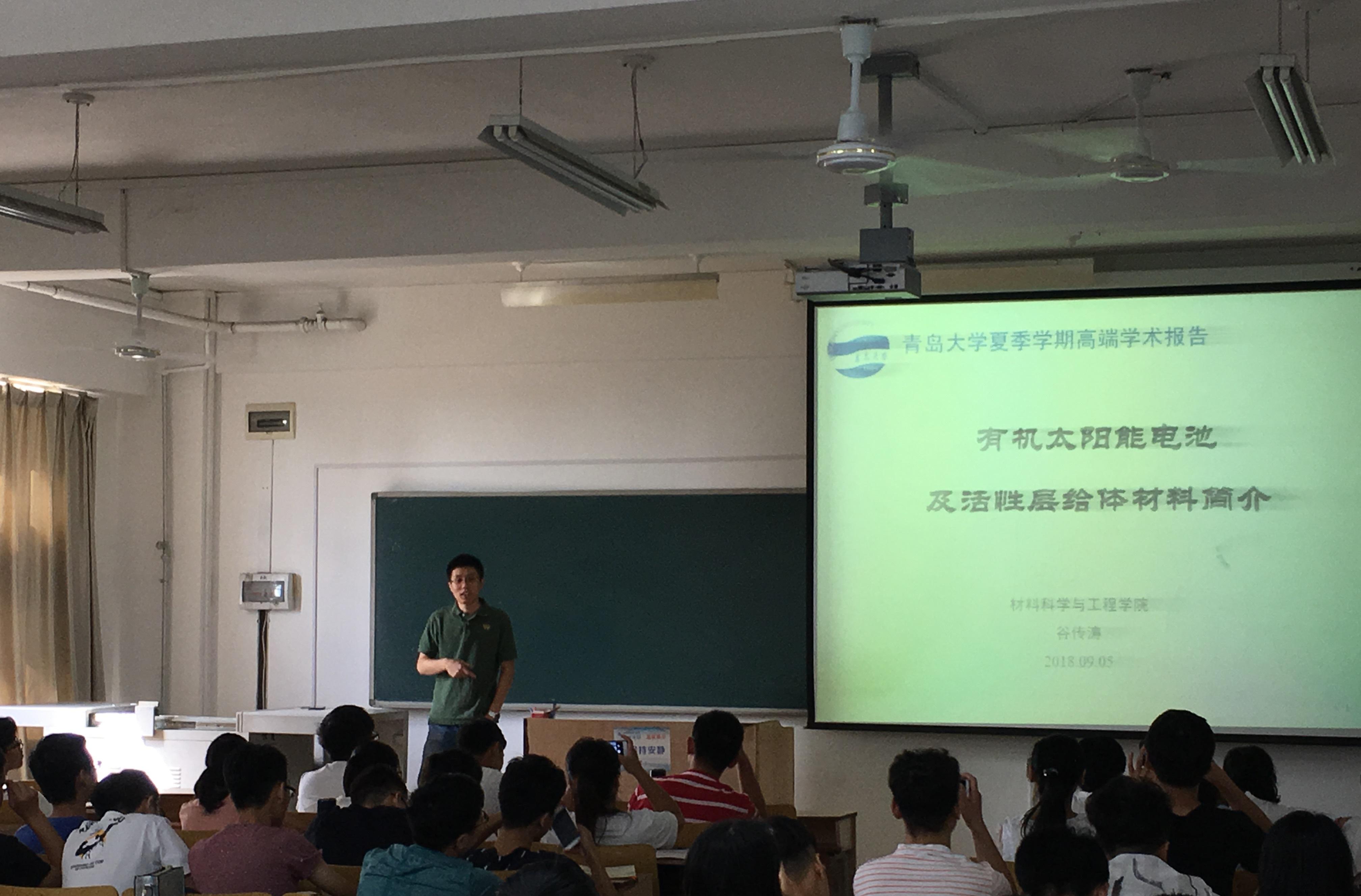 青年教师谷传涛做了夏季学期高端学术报告,报告题目为《有机太阳能电池及活性层给体材料简介》,老王论坛