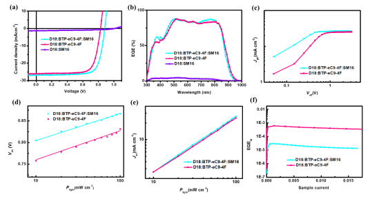 与典型的带有卤素取代的末端基团的融合环状电子受体(如Y6、BTP-eC9-4F、L8-BO等)不同,带有两个三维形状的持久性末端基团的小分子受体SM16具有高荧光量子产率、减少分子间相互作用、提高溶解度和中等的结晶度。因此,SM16对于制造绿色溶剂处理的三元OSCs,以改变活性层的形态和减少太阳能电池的能量损失是非常有希望的。另一方面,与二元太阳能电池相比,以SM16为第三种成分的绿色溶剂处理的三元太阳能电池显示出更好的光伏性能。基于D18:BTP-eC9-4F:SM16的三元器件尤其如此,与二元器件(D18:BTP-eC9-4F)相比,其PCE为18.20%,Voc、Jsc和FF值同时得到改善。进一步的研究显示,在D18:BTP-eC9-4F系统中加入SM16可以诱导出双连续的互穿网络,减少能量损失,并抑制太阳能电池中电荷载流子的重组损失。总而言之,我们的工作为制造绿色溶剂加工的高性能OSC提供了有效的策略。