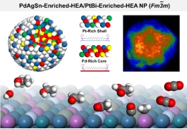郭培志教授课题组近期主要从事金属及其合金胶体纳米晶合成和电催化方面的工作 (Sci. China Mater. 2023, 66, 150; 2022, 65, 2694; Langmuir 2021, 37, 14930; 2020, 36, 11094),围绕应变效应、配体效应以及两者的协同效应研究合金催化剂结构与性能的关系,并利用第一性原理计算进行了分析 (J. Energy Chem. 2023, 79, 279; ACS Sustainable Chem. Eng. 2022, 10, 6843)。高熵合金纳米粒子 (HEA NPs) 以其独特的电化学、催化和机械性能,以及对多步反应的多样性活性和多元素可调性而备受关注。如何制备粒径、形貌和应变可调控的高熵合金颗粒成为当今研究的一个重点课题。