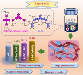 在器件工程方面,受压力锅原理的启发,作者设计了一种高压方法(HP方法)来解决与高分子量D18相关的可加工性问题。通过这种方法,能够在100°C的压力下将高分子量D18(HW-D18)完全溶解在氯仿中,提高了氯仿的沸点和溶解能力,最终使得HW-D18氯仿溶液在冷却至60°C后能够形成均匀的薄膜。与在室温下使用较低分子量D18(LW-D18)制备的共混膜相比,通过HP方法制备的HW-D18基共混膜表现出卓越性能,包括更有序的分子堆积、更高的结晶度、延长的激子扩散长度和优异的相形态。因此,通过HP方法制备的基于HW-D18:L8 BO的OSC实现了19.65%的卓越PCE,创下了迄今为止二元器件效率记录的最高值。