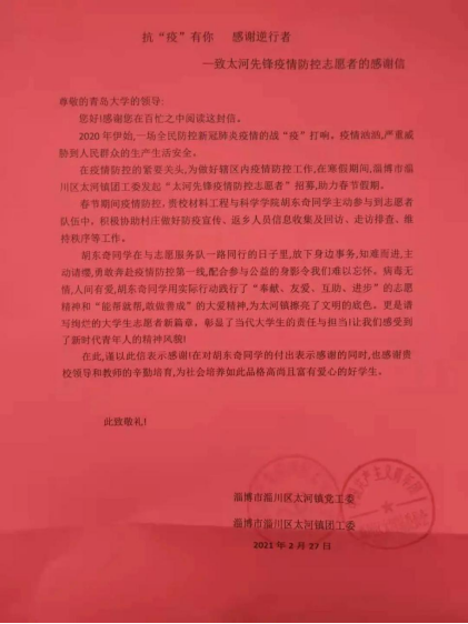 材料学院鼓励支持材院学子积极主动参与社会实践活动。在保证自己学习和生活的前提下,积极主动的投身社会实践活动,向社会贡献材院学子的力量同时还能提高自身能力。希望材院学子向胡东奇同学学习,积极参与、勇于奉献,用自己的行动诠释当代大学生的责任与担当,为社会贡献材院学子的一份力量!为建党百年献礼!