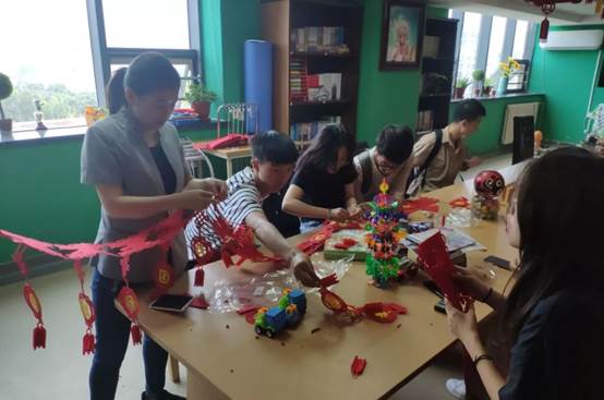 上午8点到达敬老院后,同学们在敬老院薛老师的带领下开始了志愿者工作。志愿者们被分为三组,一组负责做简单的手工挂饰,为老人们的活动室增添更为浓重的节日色彩。二组在活动室为老人们唱歌、跳舞、下跳棋、聊天,为老人们带去欢乐。三组负责跟随张老师为老人们发送当日报纸,运送老人们部分当天需要的生活用品。志愿者工作结束后,同学们把老人们送回房间休息,并打扫了活动室。