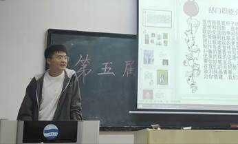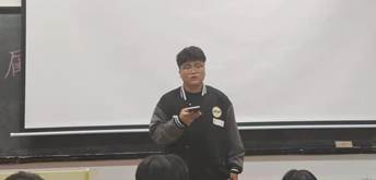 第四届社联主席梁彬学长上台发言。梁彬学长向同学们提出一些建议,希望同学们以学习为重,培养自己的兴趣爱好,多参加竞赛,同时也要做好社团工作,让自己的大学生活变的更加丰富多彩。