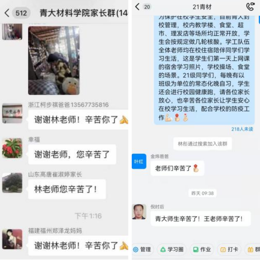 青岛发生疫情,牵动着学院1300多个学生家庭的心,各年级辅导员通过家长群,实时直播学生在校的各类动态,让家长更直观全面地了解学生在校期间的生活学习情况,帮助家长了解疫情形势和学校疫情防控工作,深化家校联动,请家长放心,并支持配合学校疫情防控工作,不仅做到“屏”对“屏”,“键”对“键”,更做到“心”贴“心”,“情”连“情”。