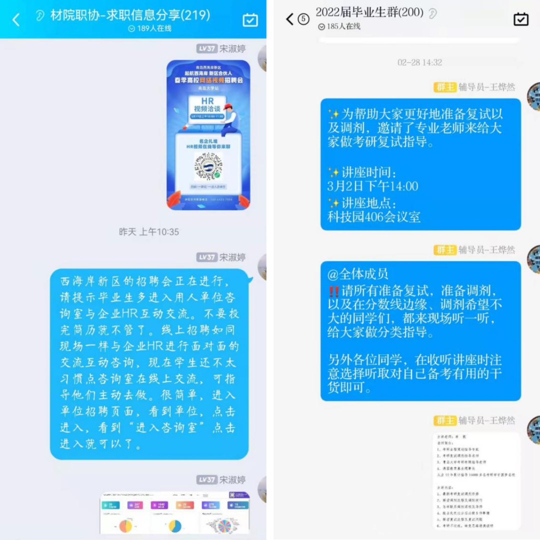 毕业年级辅导员为学生提供悉心的就业指导,动态管理就业信息,统计已确定工作的学生就业去向,分类整理求职过程中的重点难点,以便其他学生学习借鉴;在线分享求职经验,邀请优秀毕业生开展就业指导讲座,分享求职经验,讲解竞聘技巧。针对学生考研、留学、就业等不同的发展目标,一对一交流指导,重点关注考研成绩不理想和未就业的学生,引导学生制定求职计划,增强就业信心和决心。与就业处协调合作,组建就业指导微信群,发布双选会通知和企业招聘信息,激励学生积极主动求职。