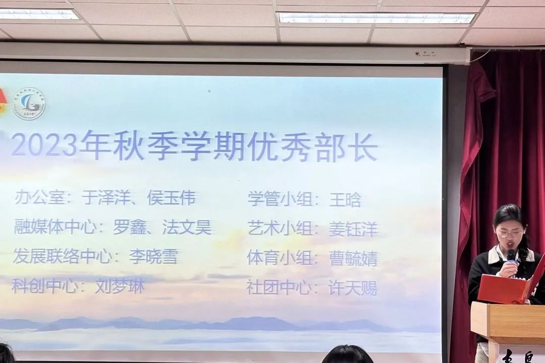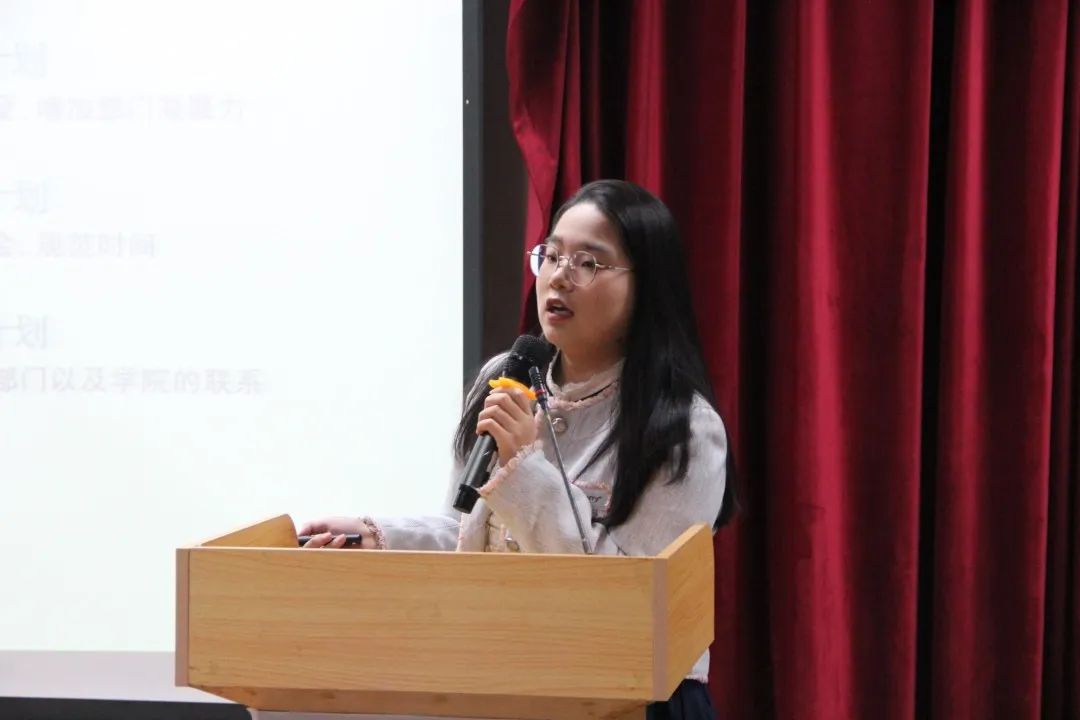 学生会各部门负责人对本学期工作进行总结,通过PPT的形式展示了这一学期部门成员的实绩,部门展开的活动,过去一学期存在的问题和不足以及对下一学期工作的具体规划。