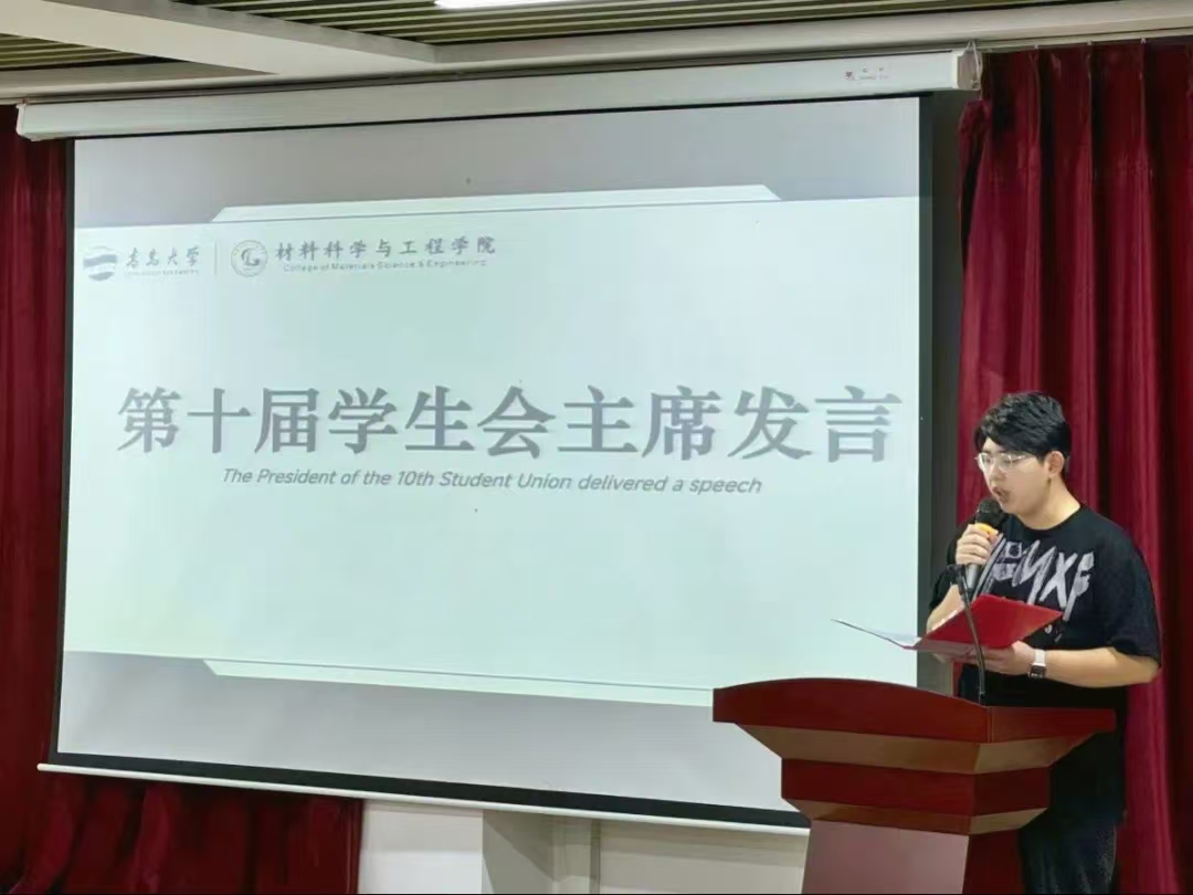 第九届学生会执行主席商帅琦在发言中代表第九届学生会对学生会新成员表示祝贺与欢迎,结合过去一年学生会工作经验,对第十届学生会提出三点要求,他指出,在过去一学年中,学院学生会各部门团结协作,同向同行,推进各项工作落实落细,并祝福新一届学生会在继承中创新,收获累累硕果。