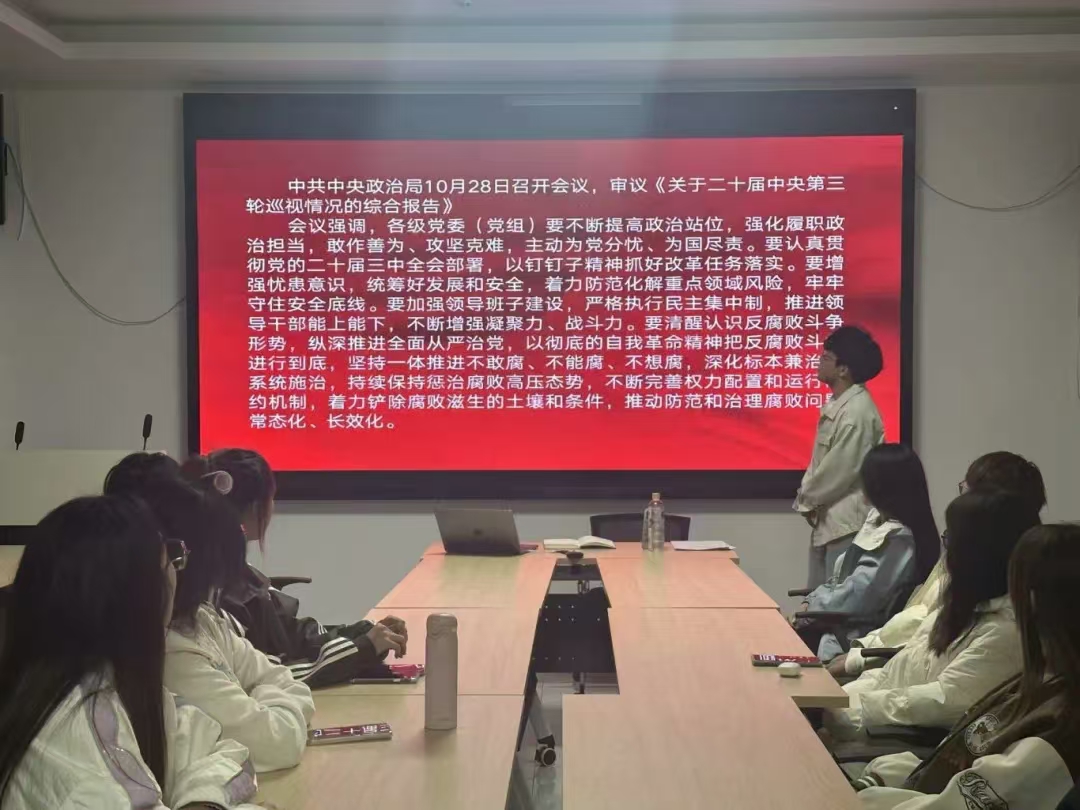 会议第二部分,学生会主席廖添旭带领学生会成员进行政治理论学习。主要学习了审议《关于二十届中央第三轮巡视情况的综合报告》,强调了要认真贯彻党的二十届三中全会部署,以钉钉子精神抓好改革任务落实、纵深推进全面从严治党,以彻底的自我革命精神把反腐败斗争进行到底。