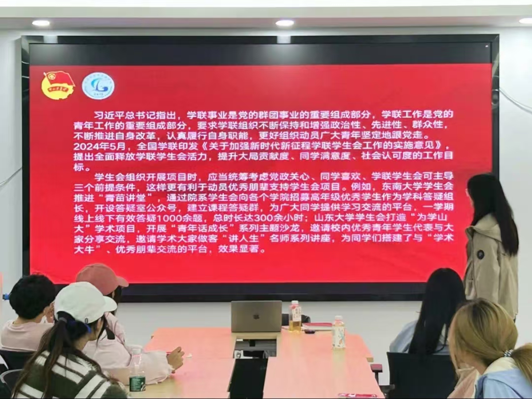 会议第二项,学生会融媒体中心部长刘以喆带领学生会成员进行政治理论学习。主要学习了山东省学生联合会关于推进学联事业的最新文件,着重强调了学联组织是党的青年工作的重要组成部分,要求学联组织不断保持和增强政治性、先进性、群众性,不断推进自身改革,认真履行自身职能,更好组织动员广大青年坚定跟党走。