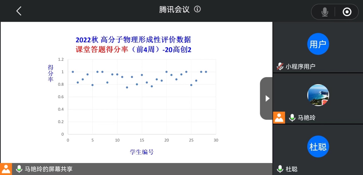 高分子材料基础和高分子材料加工教研室通过腾讯会议开展主题为《课程形成性评价》联合教研活动,高分子材料基础教研室主任马艳玲老师主持会议,教研室全体教师参会。会议通过前期高分子物理课程学生课堂答题、雨课堂测试情况,探讨了课程形成性评价的形式及要求,如过程性考核应包括:1.学生课堂答题,2.阶段测试,3.线上提交课后作业等;交流了不同课程班学生过程性评价的合理统一性原则。