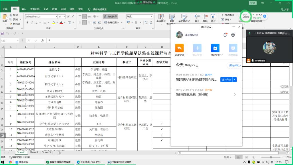 复合材料基础和复合材料加工教研室通过腾讯会议开展主题为《超星泛雅平台在线课程建设探讨》联合教研活动,复合材料加工教研室主任李培耀老师主持会议,教研室全体教师参会。李老师介绍了教研室课程在超星泛雅平台的建设情况及清查过程中发现的一些问题,以《功能高分子材料》、《专业英语II》、《文献阅读与写作》课程资料为范本,讲解了如何在网站上传所需的材料。要求后续所有课程教师按照要求尽快准备、上传相关资料。