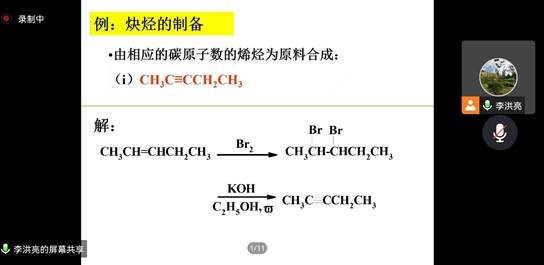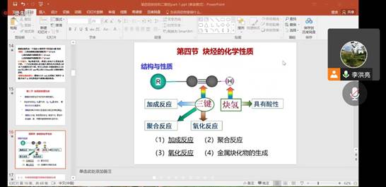 此次课程,李洪亮老师讲授的是《有机化学》中《炔烃的化学性质》小节,首先复习炔烃物理性质,结合学生高分子专业背景和碳碳三键的成键特点,引入炔烃化学性质讲解;注重有机化学学科特色,穿插课程内容考核重点难点分析;引导同学参与在线授课互动,顺利开展线上教学。