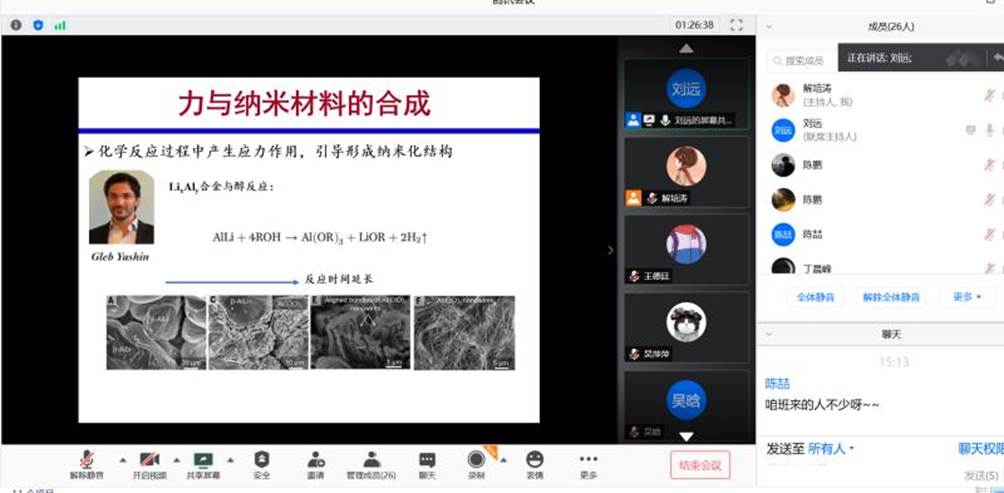 刘远老师详细分析功能材料设计和应用背后微观作用力的“好”与“坏”,解析纳米材料应用中应力-功能转换机制的巧妙构思,并向同学们讲解如何选择性的使用力来服务于材料的结构设计,从而实现新型功能材料在储能、催化和环保领域中的高效应用。