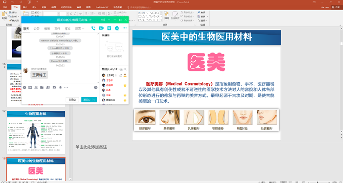 胡浩老师从纳米材料讲起,介绍了纳米材料主要是纳米载体在肿瘤治疗中的应用,以及生物医用材料在医美中的应用,学生对生物医药等领域的进展表现出了很高的兴趣。