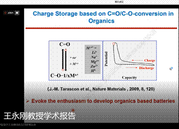 报告中,王教授着重介绍了有机电极材料的优势,如储量丰富、环境友好、绿色环保、可持续发展等。报告细致地展开介绍了有机物作为电极材料的电荷储存机制,以及其在单价(Li+/Na+)、多价(Mg2+/Zn2+) 金属阳离子和质子(H+)存储领域的具体应用和所涉及的界面电化学问题;同时利用该储能机制和相应的界面特性,发展出一系列具有超长寿命且环保低毒的水系有机物电池,以及能够在超低温条件下工作的电池体系;报告最后讲述了基于有机物电极的电解水-氢氧分离制备技术。报告内容精彩丰富,展示的动画惟妙惟肖,语言通俗易懂。在报告中对老师和同学们的提问知无不言,营造了一个较为舒适的学术交流氛围,让大家畅所欲言,给在场的师生们上了生动且极具意义的一课,让与会的师生们收益颇丰。