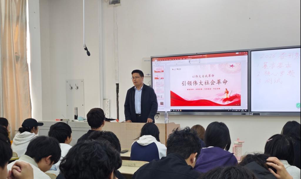 2024级本科学生讲授形势与政策课。徐大连紧密结合党的百年奋斗历程与新时代使命任务,围绕党的自我革命理论与实践与同学们展开深入交流。
