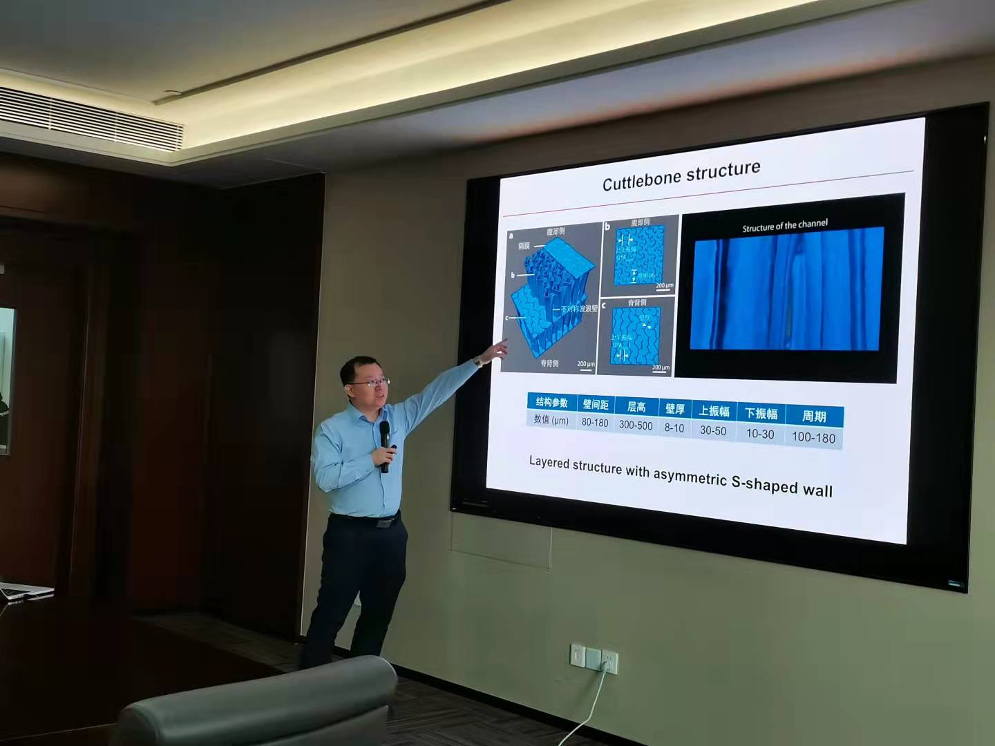 报告主要内容:生物材料经过长期进化,在材料组分有限的情况下,通过构筑多尺度复杂有序结构实现了许多令人羡慕的优异性能。因此,向自然学习已逐渐成为发展新材料的有效手段和途径。在深入研究墨鱼骨、木材、北极熊毛等生物材料优异特性的基础上,柏浩研究员课题组利用冰模板法、3D打印等材料制备方法,对这几类典型生物材料的多尺度复杂有序结构和功能进行了模仿,制备了多种具有应用前景的仿生材料,并在报告中具体介绍了相关研究成果。这些仿生材料在航空航天、军事装备、个人防护等领域都展现出了广阔的应用前景,引起了学术界和工业界的极大关注。