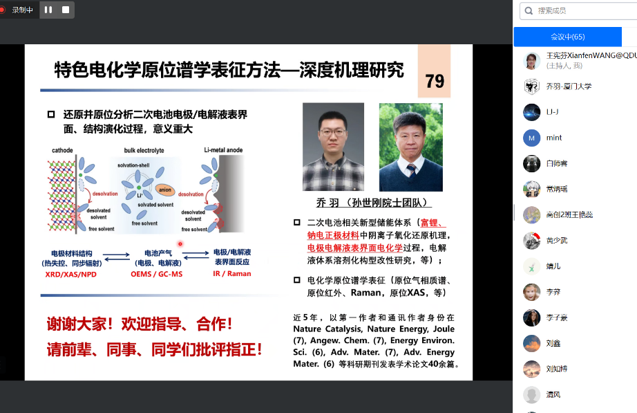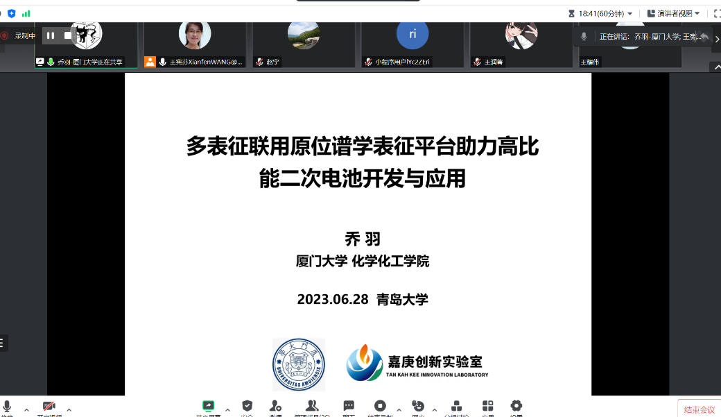 2023629日下午,厦门大学乔羽教授应学院邀请,作了题为《多表征联用原位谱学表征平台助力高比能二次电池开发与应用》的高端学术报告,采用线上腾讯会议的方式,近百名师生听取了报告。
