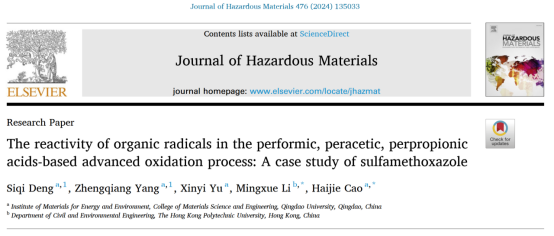 近期,老王论坛 高分子材料与工程专业2022级本科生邓思琪以第一作者在SCI一区期刊Journal of Hazardous Materials(IF=12.2)上发表一篇题为《The reactivity of organic radicals in the performic, peracetic, perpropionic acids-based advanced oxidation process: A case study of sulfamethoxazole》的研究论文,该工作在能源与环境材料研究院开展,曹海杰副教授为指导教师和通讯作者