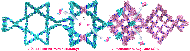 过氧化氢是一种有价值的清洁化学能源,在水处理、能源技术、化学合成和造纸等方面有广泛的应用。目前,用于过氧化氢生产的传统蒽醌氧化工艺(Anthraquinone oxidation process, AOP)存在高能耗和环境污染。因此,氧还原反应(Oxygen reduction reaction, ORR)由于其分布式和小型化的设备和绿色电力的节能工艺,是实现清洁过氧化氢生产可持续经济的一种未来前景。共价有机框架材料(Covalent organic frameworks, COFs)具有组分可调、孔道结构高度有序、比表面积大、易于功能化修饰等优点,为开发功能性材料提供了强大的平台。选择多样化的结构构建块可以产生稳定和功能化的COFs,其在框架表面具有丰富的活性位点和明确的晶体孔隙率,在多相催化中表现出巨大的前景。众所周知,多组分COFs在物理化学功能方面比双组分体系中具有突出的优势,成为一种有效的调控策略。但目前多组分的报道主要集中在同一维度,对于具有2D和3D单元交错的多组分COFs的拓扑控制很少。因此,对于增强ORR的无金属COFs仍缺乏多维设计和多组分调控。