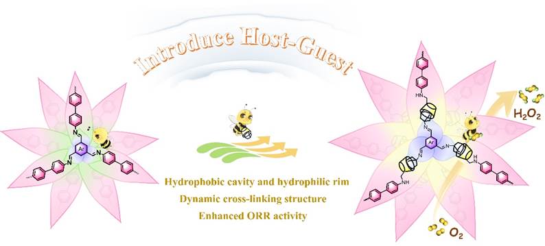 过氧化氢是一种高价值化学品,广泛应用于能源储存、污水处理、卫生消毒和纸浆漂白等领域。目前,过氧化氢的工业生产主要依赖于废弃物密集型的蒽醌氧化工艺,这不仅引发环境问题与严重的安全隐患,还伴随着昂贵的催化剂成本和巨大的能源消耗。电化学氧还原反应(ORR)因其温和的水反应环境及能够利用绿色电力作为能源输入,而被视为一种清洁生产过氧化氢的有效途径。非金属碳基材料被认为是商业化的贵金属基电催化剂的最有前途的替代品,但它们在实现高产物浓度与生产效率方面仍面临着巨大挑战。超分子聚合物,凭借其独特的分子识别能力和动态交联特性,在催化领域展示出了巨大潜力。然而,针对高效氧还原制过氧化氢的超分子电催化剂少有研究。因此,设计具有高效选择性和ORR活性的超分子氧还原电催化剂用于过氧化氢合成尤为迫切和重要。