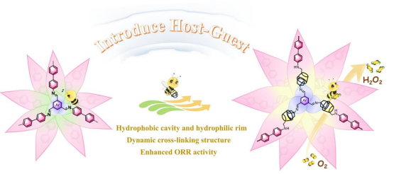 基于这一科学问题,团队实施了一种创新的动态主客体策略,旨在精确调控并合成高性能的超分子电催化剂。具体通过将主客体单元插入到共轭微孔分子骨架中,成功开发出两种新型动态交联的超分子电催化剂。动态可调的分子网络显著增强了这些结构框架内的电荷转移,优化了活性位点的电子结构,影响了主客超分子的本征活性,从而实现了优异的两电子氧还原电催化性能。