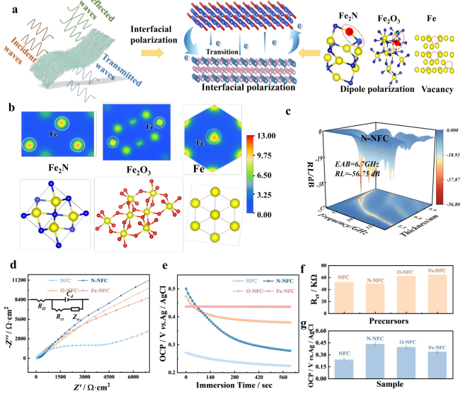 结果表明,氮和氧等杂原子在增强材料的极化效应中起着关键作用。这些杂原子引入了额外的缺陷位点并诱导了局部结构畸变,从而产生了额外的极化中心,显著改善了极化损耗和EMW吸收性能。得益于独特的杂原子梯度分布与多尺度异质结构设计,Fe₂N@Ni₃Fe/CNF复合材料展现出卓越的吸波性能,材料同时展现优异的耐腐蚀特性,根据电化学阻抗测试显示电荷转移电阻最低,基于DFT模拟结果,Fe2N、Fe2O3和Fe在吸波材料中通过多重损耗机制协同优化阻抗匹配,有效增强电磁波吸收性能。这项工作通过建立杂原子-界面构效关系模型,为新型电磁吸收材料的原子尺度工程化设计提供了理论依据。